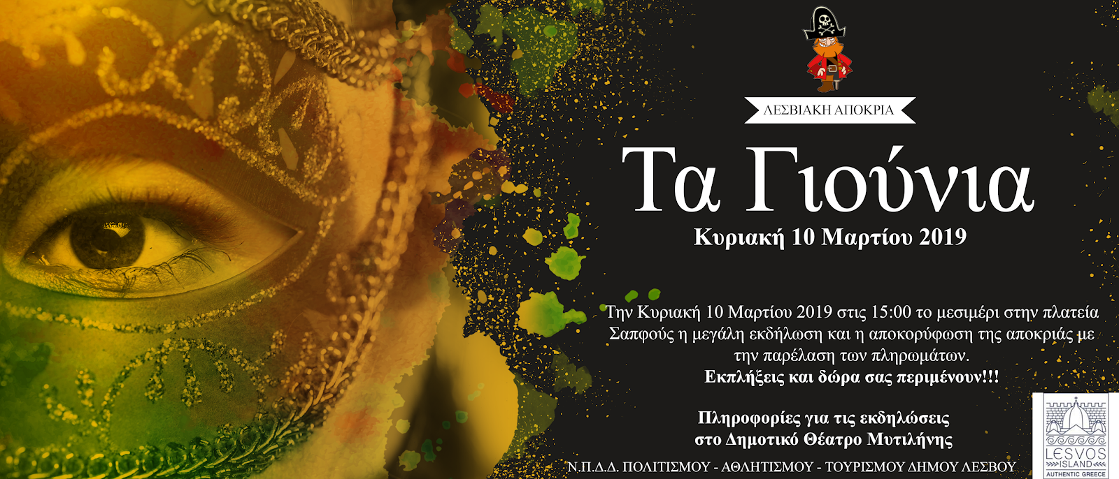 Την Κυριακή 10/3/2019 στις 15:00, στην πλατεία Σαπφούς, θα γίνει η μεγάλη εκδήλωση και η αποκορύφωση της αποκριάς με την παρέλαση των πληρωμάτων (εκπλήξεις και δώρα σας περιμένουν!!!)